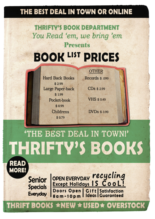 Upon finishing an online Adobe tutorial I wanted to practice more of what I learned. This Poster design is what I came up with while using the techniques in the tutorial. The type tool was used the most for this particular design. Sans and sans serif fonts, outlining, masking, and use of the kern tool are some examples of how the type here was created for the layout. Other tasks including; photo editing; filter applications; Cutting/pasting various elements; Shape creation and transforming. To make my idea come together I also needed to create some copy for advertisement, which expresses the best bargains available. I used 3 type faces to create a bold piece and took a photograph of an open book. |